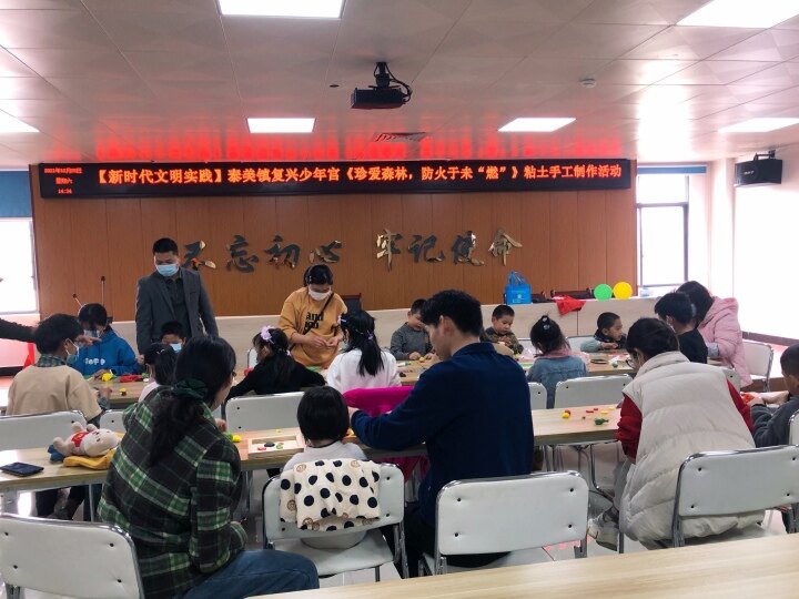 随后志愿者分发黏土、底板以及制作工具,泰美党群工作人员一边讲解一边示范如何用超轻黏土制作消防车、灭火器及小树、小草、大树、森林小动物等。讲解完成后,孩子们开动脑筋,充分发挥自己的想象力,在制作的过程中,亲子们分工合作,互动频频,互相探讨如何布置森林、如何做出正确的灭火器和消防车。最后通过揉、捏、搓、粘贴等步骤,一幅幅以“珍爱森林,防火于未然”为主题的创意作品呈现在大家面前。