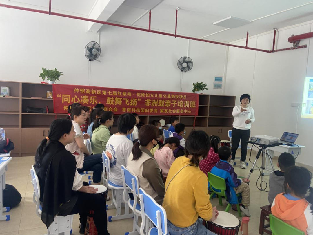 惠南科技园妇委会开办了“同心凑乐 鼓舞飞扬”非洲鼓亲子公益培训班 ,有13组家庭,约36人参加了本次培训班。非洲鼓其节奏表达情绪和快乐,能够让家长与孩子们释放压力,放松身心,投入到音乐中,体验音乐的快乐,同时也让家长与孩子们体会到了团队通力协作的快乐。
