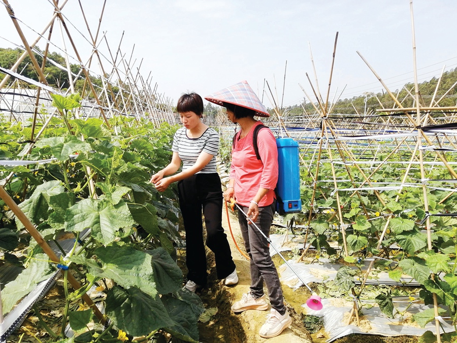 “大姐,打农药也有技巧,这样喷洒更好……”在离养殖基地不远的一片蔬菜种植地里,何娟一边指导农户更有效地喷洒农药,一边传授病虫害防治知识。