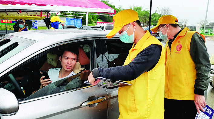 龙门县退役军人战旗志愿服务大队的志愿者在交通要道路口协助开展疫情防控工作。