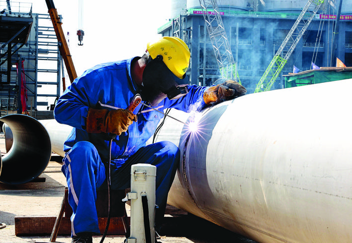 大亚湾石化区工人正在全神贯注进行焊接作业。