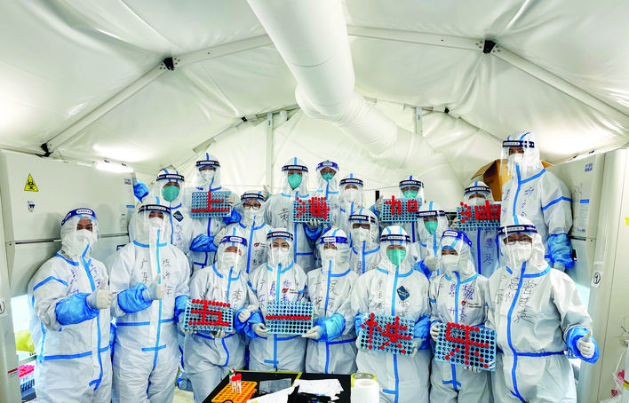 惠州支援上海核酸检测的医护人员在千里之外的实验室向家人问好并为上海加油鼓劲。