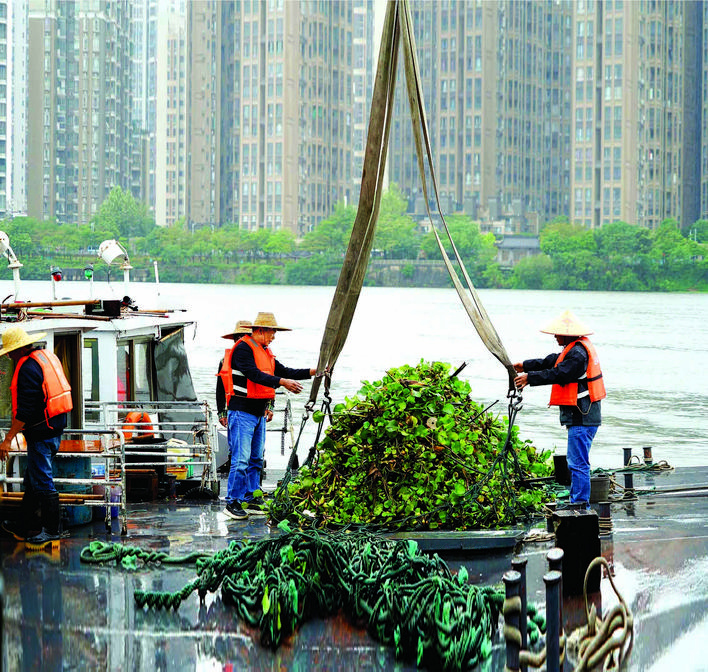 水上环卫工人对东江、西枝江、新开河的江面进行保洁。