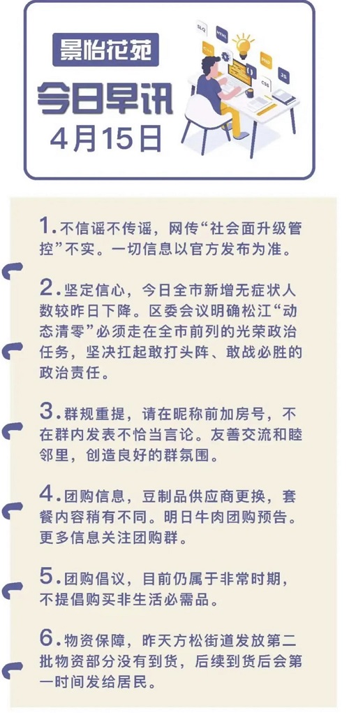为了让宅家的居民能及时了解最新的政策和小区情况,使信息的公开透明和有效传达,近日,松江泗泾区方松街道景怡花园小区的志愿者们自发编写并精心制作的疫情防控《今日早讯》,连续在业主群内转发“走红”,给小区居民们的居家抗疫生活增加踏实感、安全感。