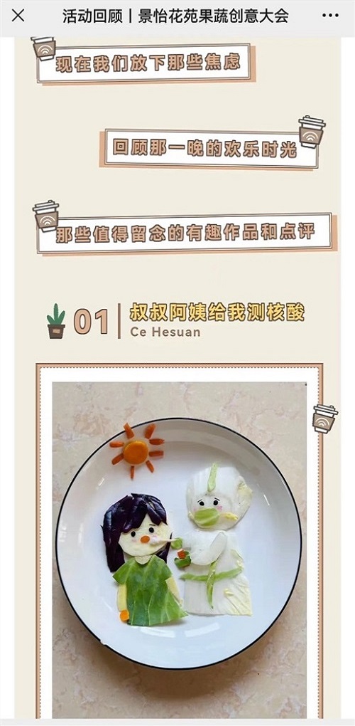 除了数据更新和工作动态播报,小报的温馨有趣也是居民们津津乐道的地方。在4月13日的今日早讯上,“家庭果蔬创意大会”的字眼让封控多日的居民不禁跃跃欲试,大家纷纷投稿报名。紧接着,在4月15日的活动回顾里,“蔬果也疯狂,爱拼才会赢”的主题在大家诙谐有趣、才艺尽显的作品中体现得淋漓尽致,成了焦虑生活中的舒缓剂。