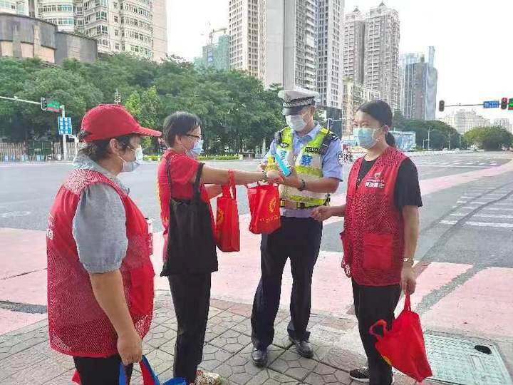 志愿者们带上装有凉茶、藿香正气水、爱心糖水的清凉品,及装有口罩、免洗消毒洗手液等防疫包的爱心物资出发了。市最美志愿者张桂芳、邓志芬等先给驻守在河南岸社区服务中心的志愿者、医护人员送上清凉防疫包。接着,市最美志愿者赖丽芳、张明会等带着数名大学生志愿者,给河岸道辖区用辛勤的汗水“擦亮”城市道路“容颜”环卫工人、快递小哥递上一份清凉、一份防疫关爱。志愿者们还来到花边岭路口、港惠路口、三环装饰城路口,给维持公路秩序和交通安全的交警,也送上清凉品和防疫包,叮嘱大家要注意身体,防暑防疫。