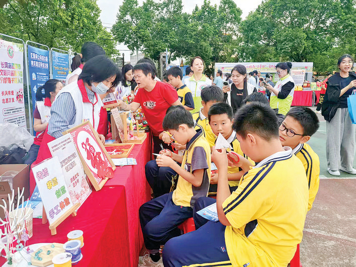 集市还设有丰富多彩的体验互动区,吸引不同年龄层的村民积极参与。在全民阅读区,加速度志愿服务队带来各类书籍,鼓励未成年人养成阅读习惯,“扣好人生第一粒扣子”;手工技艺体验区,来自鹅城巧娘手工艺发展中心、惠城区民间文艺家协会的志愿者现场展示编织技艺、非遗剪纸、手工拓印等传统手工艺,吸引众多妇女和儿童动手体验……