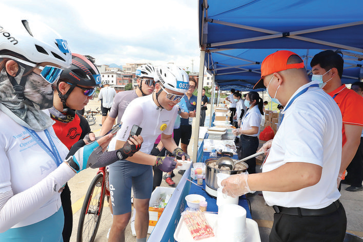在骑行的起点和终点,都设有农特产品展销区。在罗浮山风景名胜区旅游文化广场,有30多家来自博罗的农特产品企业在此展销,汇集了葛仙堂姜茶、金线莲饮品、嘉粤甘草梅、金钱龟饮品等当地特产。10月30日下午,不少骑手签到领取物资后,便迫不及待地在广场打卡特色美食。来自深圳的骑友林水清说:“这里的美食很多,很诱人,我品尝了好多种,还买了一些准备带回家。”10月31日上午,出发点的摊位依旧展示着各类农特产品。惠州中农鼎盛农业有限公司负责人杨锋波带着他新开发的荔枝红茶前来展示,供骑友试饮。杨锋波说,荔枝红茶用柏塘山茶与罗浮仙荔发酵制作而成,口感香醇。“此次骑行活动是一个很好的展示推广平台,为新品推广打下了坚实基础。”