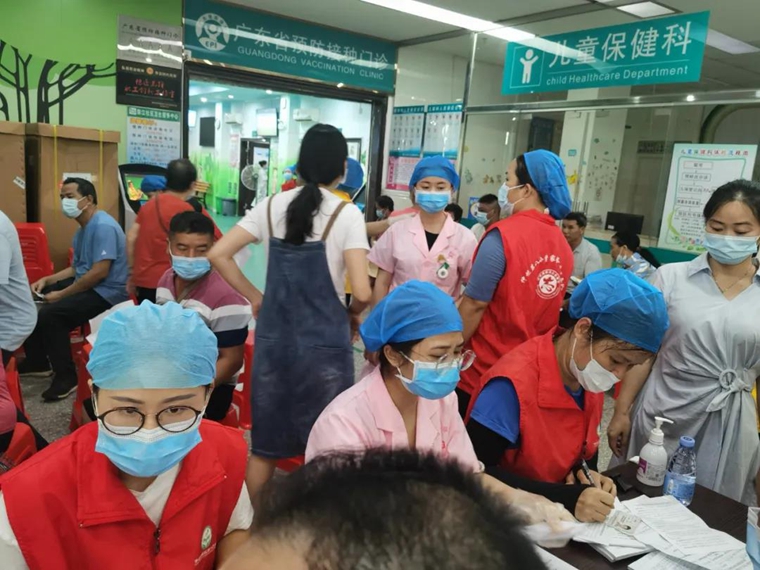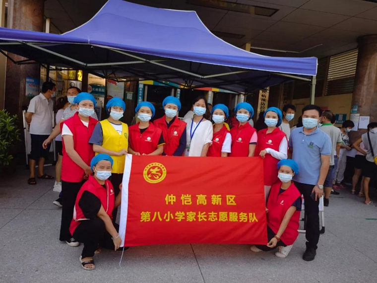 “请大家准备好接种卡,有序排队”、“请大家不要拥挤,不要拥挤,楼上还有疫苗”、“请您出示粤康码、行程码”“请仔细阅读新冠疫苗知情同意书”,每天上午八点左右开始,你要去到惠州仲恺区陈江社区卫生医院,你总会远远就听到这样的吆喝,她们身穿“ 惠州仲恺第八小学家长志愿服务队”队服,在人山人海排队接种疫苗的中心点,协助医院工作人员新冠疫苗接种,帮助医院工作人员与安保维护现场秩序。