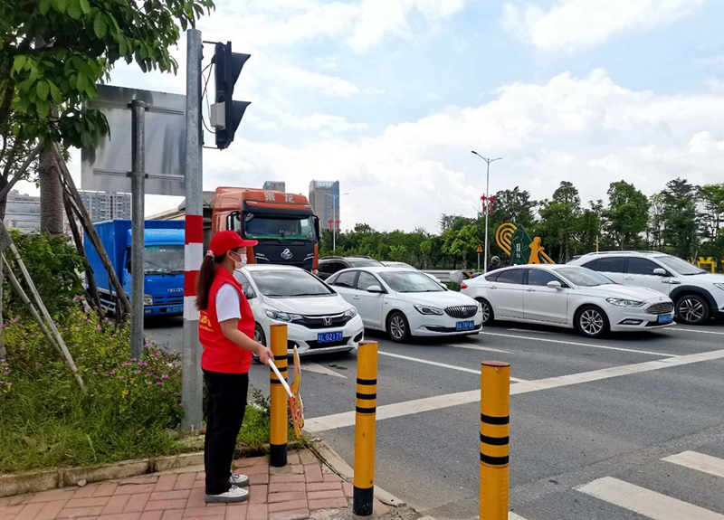 近日,记者在龙门县城迎宾大道看到,志愿者们正在引导过往群众遵守交通规则文明过马路,提醒来往车辆注意避让行人。