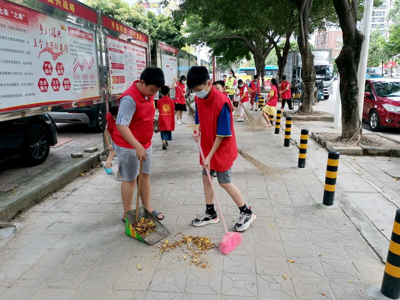 最后一节是环卫工人岗位体验。清扫路面、铲垃圾、倒垃圾,孩子们分工合作,在炎炎烈日下体验着环卫工人的辛苦。