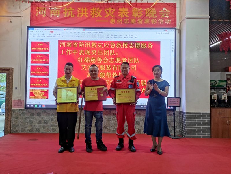 在前一阵子,驰援河南的李鸿国、郭成权、宋静等志愿者获得惠州市志愿服务联合会颁发荣誉证书。在昨日的向河南抗洪救灾勇士致敬——惠州志愿者表彰活动上,惠城区志愿服务联合会授予惠州市红棉慈善会志愿者团队、惠州市艾安琪服装有限公司、狼帮救援队2021年7月赴河南省防汛救灾应急救援表现突出荣誉牌匾,并向谭伟光、李鸿国、郭成权、牛建兵、宋静、刘洋、马剑铭等27名志愿者授予2021年7月河南省防汛救灾应急救援志愿服务工作中表现突出志愿者荣誉证书。