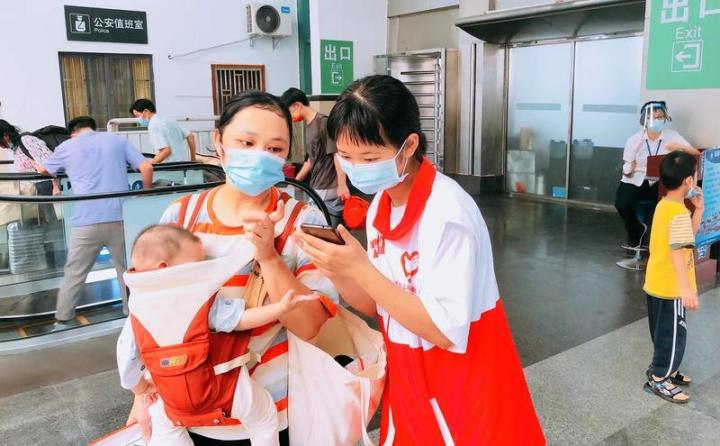10月1日上午11时许,志愿者郑文强在进站口检查旅客粤康码,维持现场秩序。这时一位四十来岁皮肤晒得黝黑的大叔着急得不得了,原来他快到点上车了,却无法打开粤康码。了解到情况后,郑文强上去帮忙,安抚他不用急,并教他转换成人脸识别方式解锁和念出数字进入粤康码界面,安全通过后在刷身份证进站又多次不通过,郑文强把他带到人工通过让工作人员识别后进入候车大厅,大叔不断地向志愿者表示了感谢。