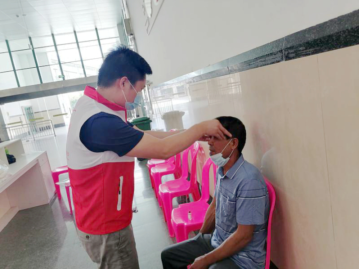 志愿者为不舒服的旅客按摩。