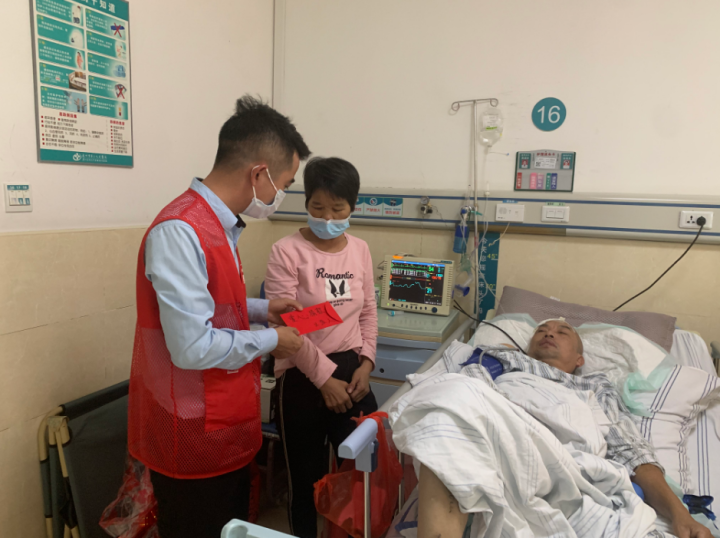 唐文海的父母平常打打散工,虽不富裕,但一家人生活也其乐融融。天有不测风云,10月25日上午,唐文海的父亲在工作途中突然晕倒,经医生诊断为脑出血,需要开颅手术。做手术需要大笔手术费,面临高额治疗费用,让唐文海一筹莫展,市义家人志愿服务队河南岸队队长黄素娜了解到唐文海的情况后,立即反馈给陈加华,经过团队商议,马上在义家人志愿服务队九个辖区的微信群里发出“爱心捐款倡议书”,一时间来自队友们的一份份爱心捐款快速传递。从10月25日晚上6时截至10月26日8时,共有200多名队友和善心人士捐助的善款12461元,大家都努力帮助队友渡过难关。10月26日上午,队友们带着善款探望唐文海的爸爸,祝福唐叔叔早日康复。