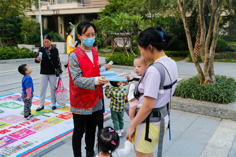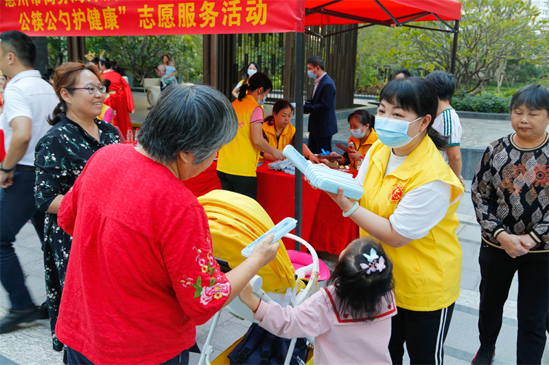 现场还有来自惠州市商务局志愿服务队、惠州市今日慈善会志愿服务队、惠州阳光探访志愿服务队、惠州市世济堂志愿服务队的志愿者以及河南岸街道居家养老服务中心的工作人员开展志愿服务活动。惠州市商务局的志愿者们身穿黄马甲,给居民现场派发公筷公勺,并向居民详细介绍使用公筷公勺的好处,以及文明健康用餐的重要性和必要性,鼓励居民自觉做文明用餐的宣传者、实践者和监督者。