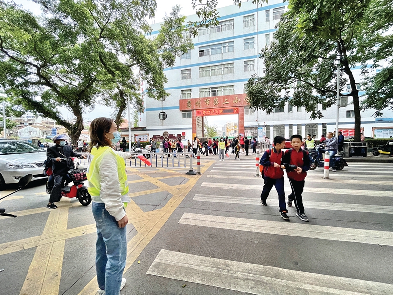家长主动参加护学岗在学校门口协助维护交通秩序。图片来源:惠州日报记者张艺明