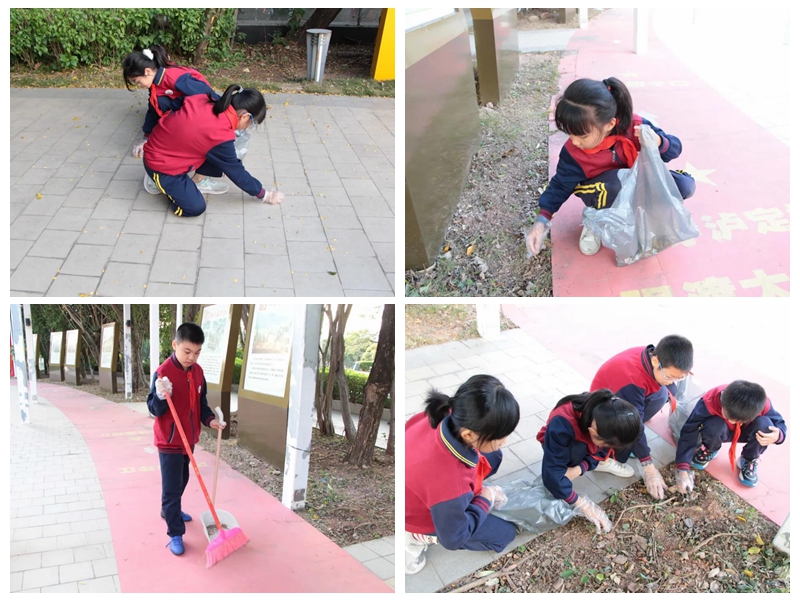 接着,队员们齐读垃圾分类“七字诀”,熟记垃圾如何分类投放。在党员老师的带领下,队员们分成五个小组,对党建公园内的落叶等垃圾进行清理并分类投放。