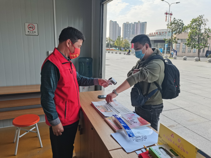 义工团南站服务队队长李志全春运为往返旅客量体温