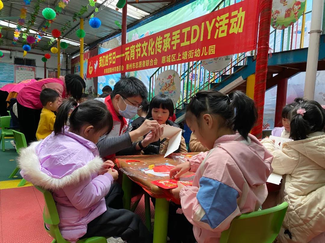 正月十五闹元宵。时值元宵佳节,惠城区上塘街幼儿园里格外热闹,由共青团惠州市委员会、市志愿者联合会、惠州市青春社区志愿服务站以及惠城区上塘街幼儿园联合开展的“我们的节日”元宵节文化传承手工DIY活动正在火热进行中。