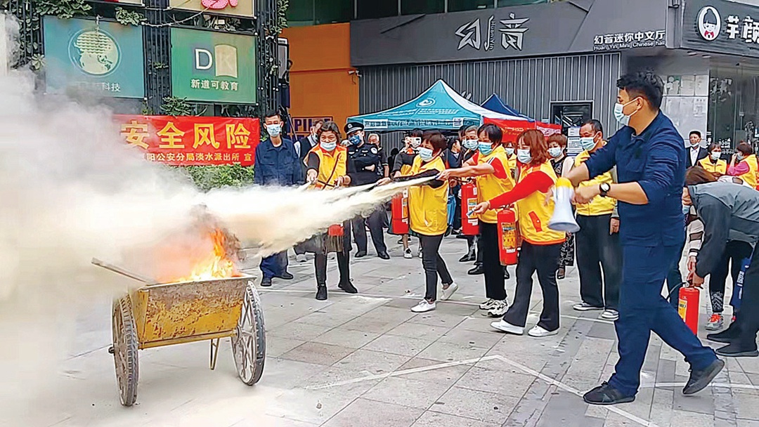 张屋社区邻里互助志愿服务队配合专职消防队开展消防技能培训。