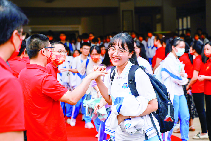 “2022,数一数二”“高考必胜,加油!加油!”……昨日一大早,市华罗庚中学高三年级教室里,加油声此起彼伏。“准考证、身份证,还有考试用具都记得带齐。”在教室里,老师们叮嘱考生们高考的注意事项,让学生们放松心态,轻装上阵,还为考生们送上“金榜题名”红包。早上8时,考生们陆续走出教室,迈向成功门,奔赴考场。学校领导和高三年级的老师们统一身穿红色衣服,排成两排为考生们送考。“向上吧,少年”“高考加油,为梦想而战”“笑对高考,喜迎未来”……老师们手持各种励志标语为考生们打Call,与考生们一一击掌。