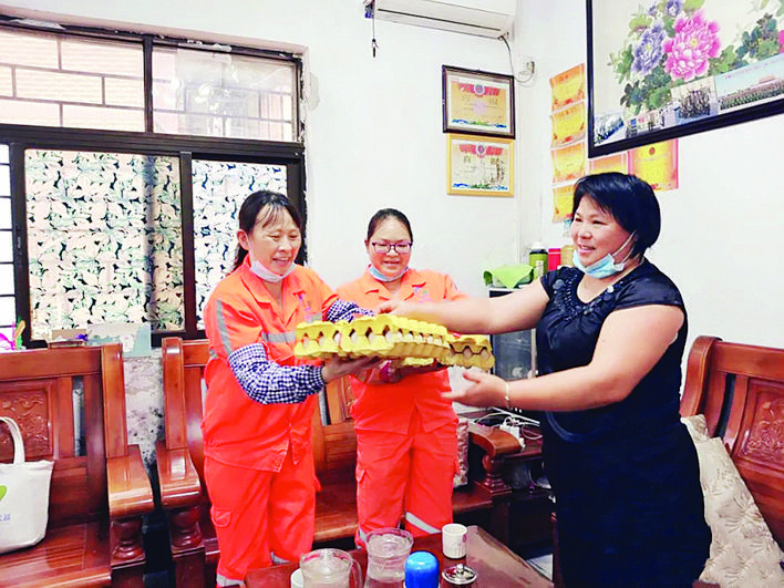 霖记粮油商行老板娘邱桂英经常赠送店内特产给环卫工人。