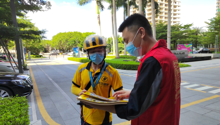 在一组志愿者忙着宣传垃圾分类、文明上网的同时,另外一组志愿者也没闲着,他们手拿电动车文明停放宣传单,向来往市民发放电动车规范停放宣传单,引导来往外卖小哥将电动车有序停放在指定电动车停放区。
