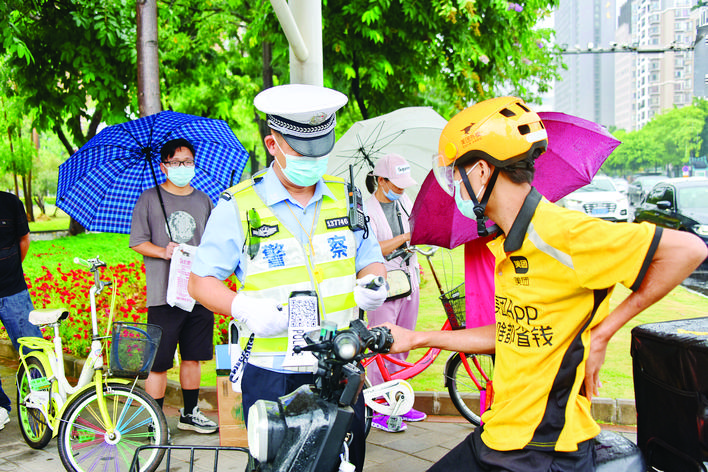惠州公安交警在路面执勤,查纠交通违法行为,宣传文明交通。惠州日报记者钟畅新 通讯员黄辉延 摄