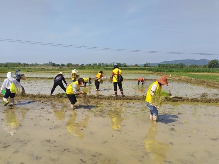 活动当天,志愿者们来到的田地里,准备为它披上“秧苗绿”。“大家左手提秧,右手从左手秧苗中分一小份出来抛进田里,秧苗之间相隔20公分左右……”指导员为大家普及农耕知识,并以身示范,让志愿者掌握正确的抛秧方法。志愿者们撸起袖子,挽起裤脚,走进水田,将一株株秧苗整齐地抛入田中,让一片新绿在田野里蔓延开来,为水田披上了生机勃勃的绿衣。
