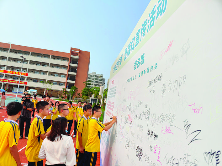 学生在签名墙上签名,承诺自觉抵制有害出版物及信息。