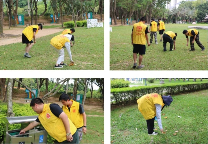 大家将沿途路面、草地里的废纸屑、烟头、塑料瓶等垃圾进行细心清理。