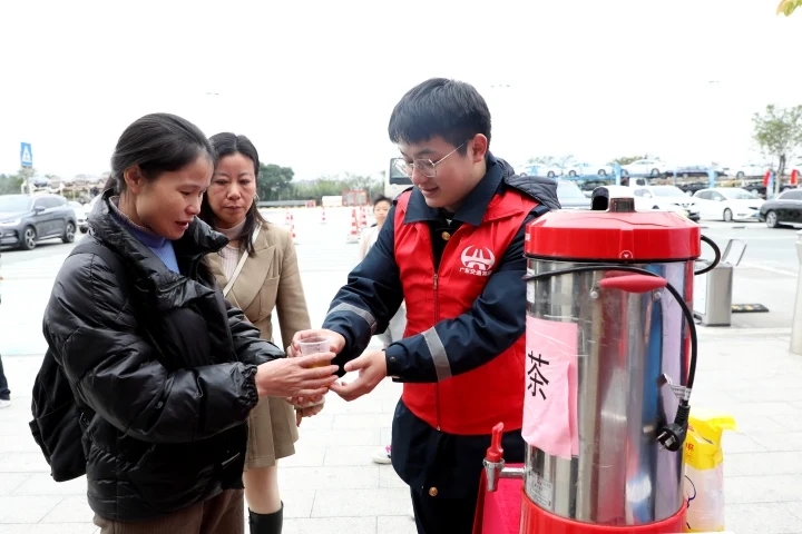 活动现场,帐篷上挂满了春节挂饰,桌上摆满了对联、“福”字、新年台历,吸引不少旅客驻足。志愿者们把一杯杯姜茶、一副副新春对联、一张张大“红”字送到旅客手中,让大家归乡的脚步更从容。