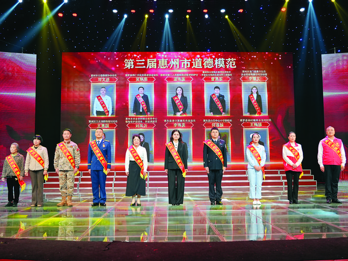 3月5日下午,惠州市“学雷锋·文明实践我行动”主题活动——第三届惠州市道德模范发布交流活动暨“身边好人”·学雷锋先进典型·新时代好少年颁奖仪式在市区举行。活动由中共惠州市委宣传部、惠州市精神文明建设委员会办公室主办,惠州市教育局、惠州市总工会、共青团惠州市委员会、惠州市妇女联合会、惠州军分区政治工作处协办,惠州日报社、惠州市广播电视台承办。