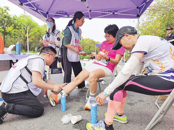 上午10时,在半马终点处,不少跑友到达后出现了腿部抽筋等疲劳情况。为了让刚刚经历完高强度运动的选手们更快恢复身体状态,来自市中心人民医院康复医学科的专业医生们亲自上阵,帮助选手进行肌肉拉伸与赛后运动功能恢复。