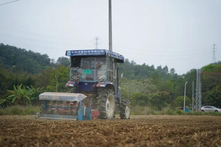 博罗县罗阳街道承粮陂村的一块农田上,花生播种机正在农田里播种。