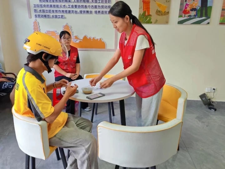 志愿者在爱心驿站里给外卖骑手送上一份糖水。