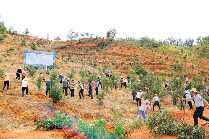 在龙溪街道埔心村植树现场,该街道班子成员率先垂范,与各村党组织书记、干部职工、党员代表、志愿者等一起,让300余株夏威夷果树在埔心村岗下村民小组烟墩石场的土地上“安家落户”。
