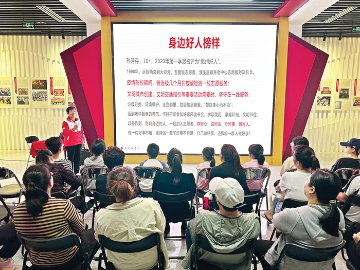 身边好人榜样孙芳存同样也是“好人宣讲队”成员。宣讲会上,孙芳存分享了她的故事。孙芳存今年73岁,但依旧活跃在志愿服务一线,2023年第一季度获评“惠州好人”。在文明旅游、文明交通指引等活动中,常常可见她的身影。她走到哪里,就把捡拾被随意丢弃垃圾的习惯带到哪里,用实际行动诠释了“勿以善小而不为”。她的事迹让在场的每一个人深受感动。