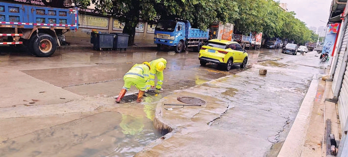 排涝人员及时疏排积水。惠州日报记者谢菁菁 特约通讯员黎华容 通讯员陈巧梅 摄
