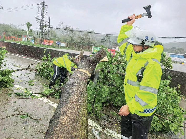 抗击台风“桦加沙”期间,惠州交警全员上岗,坚守路面一线指挥疏导交通,全力做好清障保畅工作,守护市民群众出行安全。