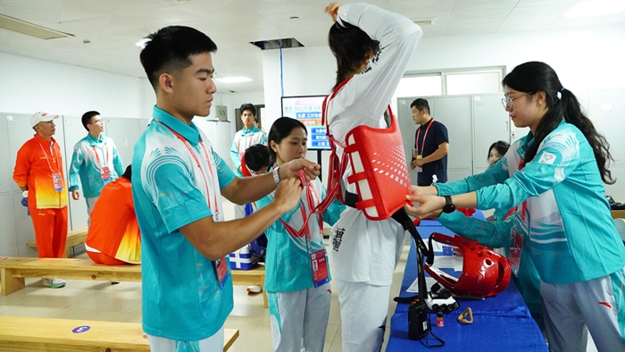在残特奥会跆拳道赛场上,志愿者们面临着更为特殊的服务考验。为提供更专业的保障,志愿者周美辰主动“加码”,利用课余时间考取红十字救护员证,熟练掌握相关急救技能。当一名运动员在赛前训练中不慎崴脚时,她第一时间上前,用所学知识进行妥善处理,并在后续康复中全程暖心陪伴。“听障运动员放慢手语道出的‘谢谢’,赛场选手之间相互鼓励的默契,让我真切感受到,奉献是另一种形式的收获与成长。”周美辰说。