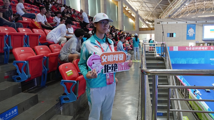 赛场上的拼搏令人心潮澎湃,赛场外的守护同样熠熠生辉。赛事期间,每天清晨,身着绿色志愿服的“小海豚”们便已就位,用朝气蓬勃的笑脸开启志愿服务。从场馆内的检录引导、器材保障,到看台上的文明观赛引导,以及交通场站、酒店的接待服务等,“小海豚”们活跃在18类岗位上,为赛事提供专业、暖心的全流程服务。