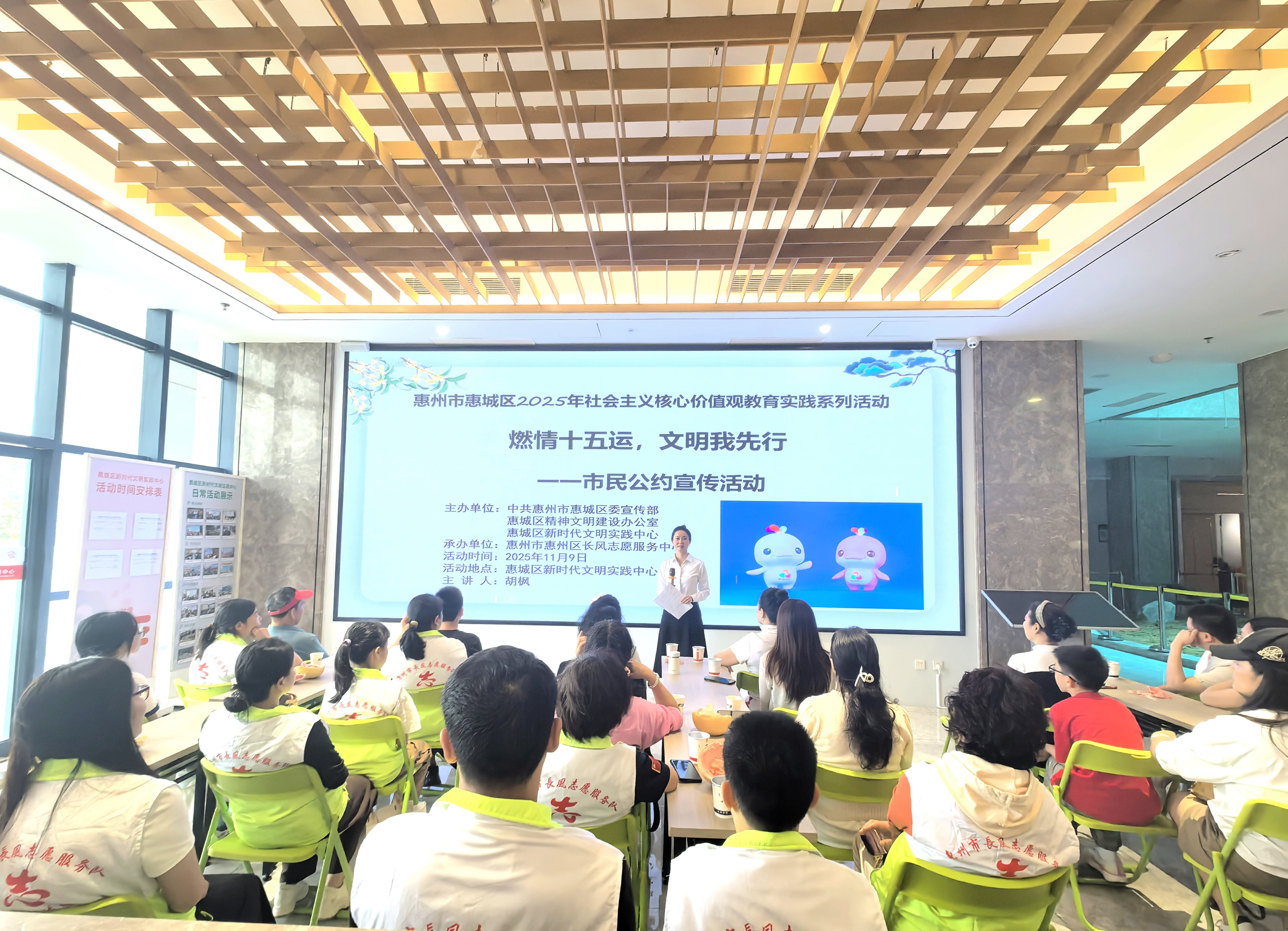 2025年11月9日,第十五届全国运动会正式拉开帷幕。当天,由中共惠州市惠城区委宣传部、惠城区精神文明建设办公室、惠城区新时代文明实践中心联合主办,惠州市惠城区长风志愿服务中心承办的“燃情十五运,文明我先行——市民公约宣传活动”,在惠城区新时代文明实践中心顺利开展。广东好人、高级礼仪培训师胡枫作为主讲人,为现场市民带来了一场生动鲜活的文明倡议课,课上带领大家共同高呼“激情全运会,活力大湾区,魅力新惠州”,活动现场还发放“燃情十五运,文明我先行”快问快答题纸,通过趣味互动形式调动市民参与热情。