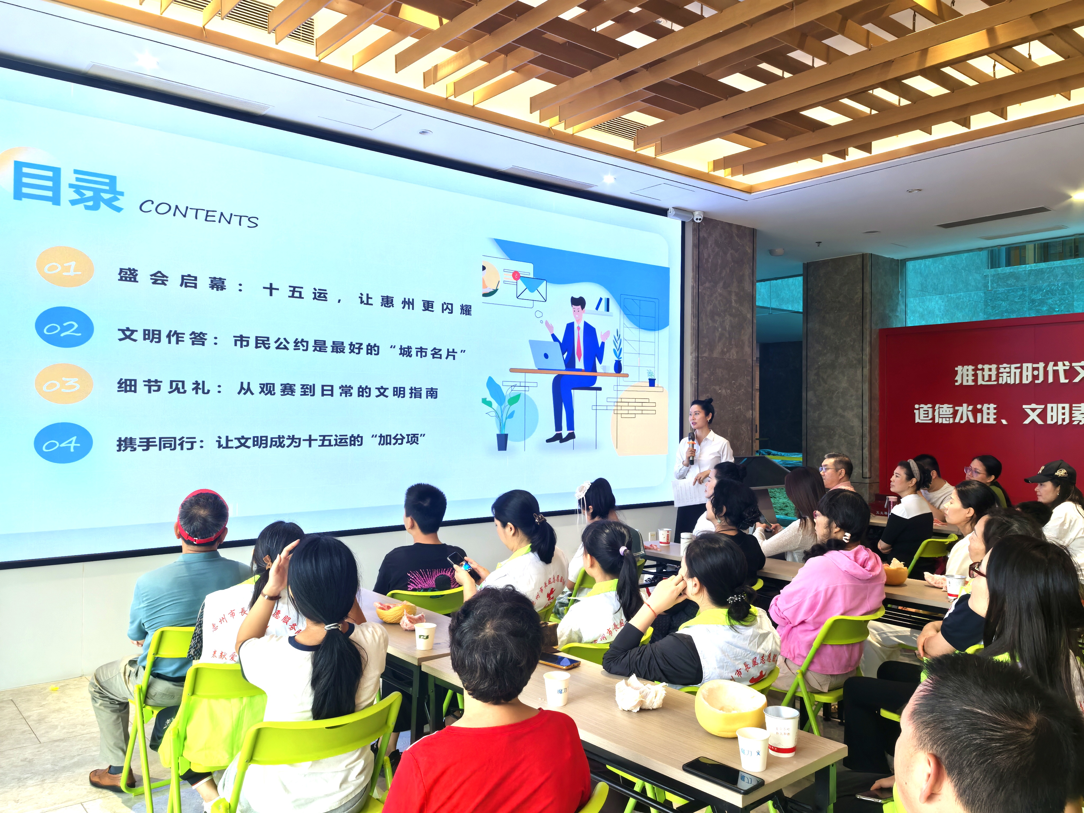 随后,活动聚焦市民公约展开深度解读,将其形象地比作惠州的“城市名片”与十五运的“行为脚本”,并提炼出“观赛有礼、出行有序、举止文明、热情有度”四大核心要点。针对观赛与日常生活两大场景,胡枫给出了具体可操作的文明指南:观赛时要提前入场、保持现场安静、理性为选手喝彩、离场时带走随身垃圾;日常生活中可通过选择绿色出行、友善为游客指路、不干扰赛事秩序等小事,为十五运“减负”、为城市“添暖”。