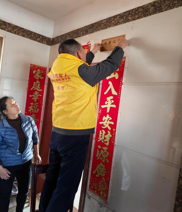 工作人员都怀着崇敬之心,在军属的见证下,将烫金闪耀的“光荣之家”牌匾庄重地悬挂于每家每户大门的醒目位置,仔细调整确保庄严端正。光荣耀眼的牌匾与军属脸上洋溢的自豪笑容相互映衬,“一人参军、全家光荣”的浓厚氛围扑面而来。