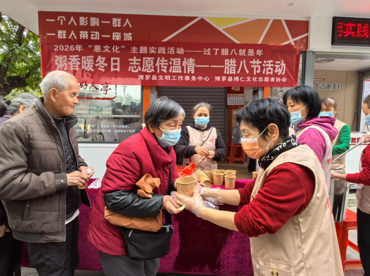 1月26日,腊八节当天,博罗县博仁文化志愿者协会、博罗县博心公益协会组织志愿者在县城范围内开展“粤志愿·迎新春”——“粥香暖冬日·志愿传温情”腊八节志愿服务活动,既为弘扬中华优秀传统文化,也以志愿服务传递节日温情。