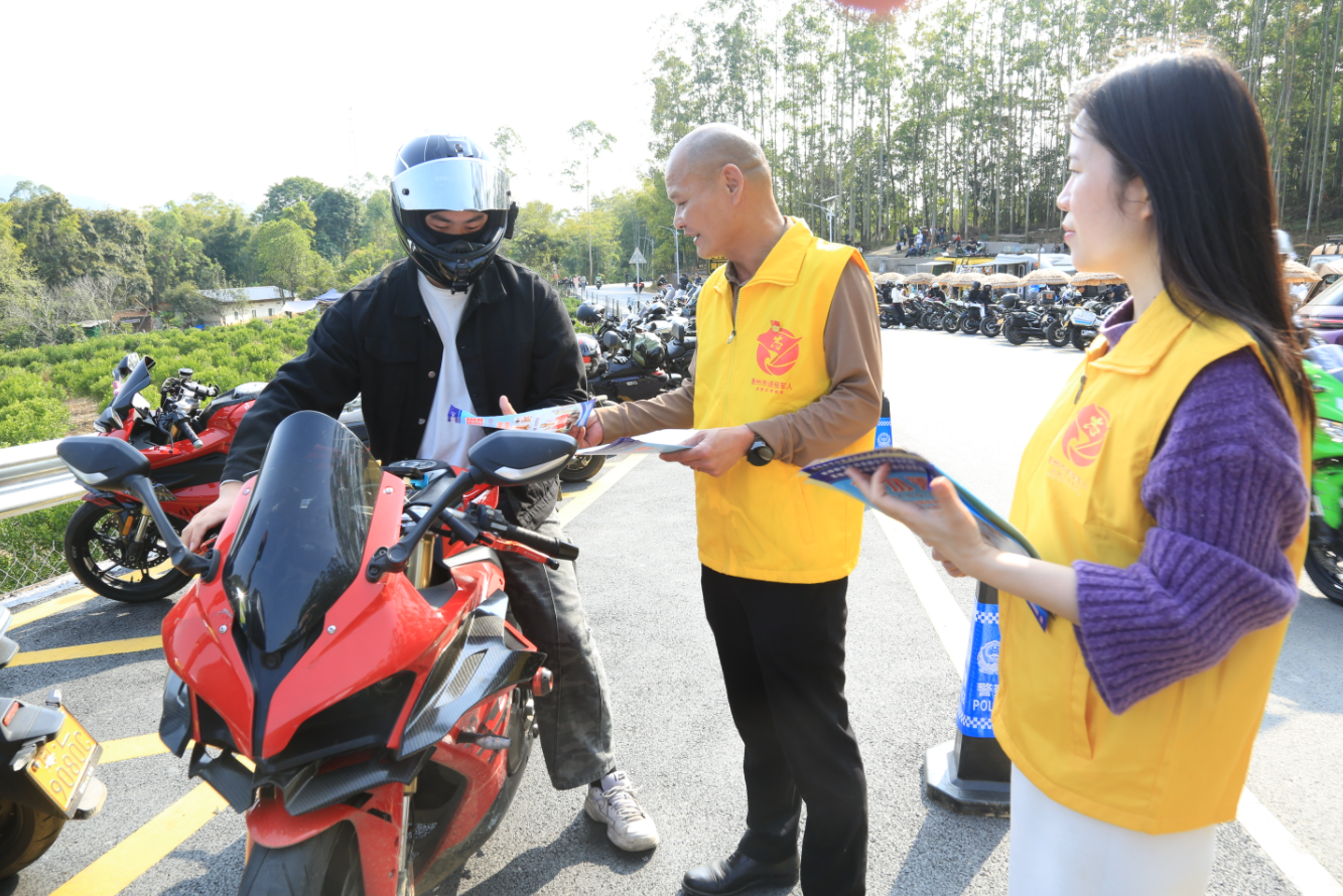 活动现场,志愿者们身着统一服装,精神抖擞、分工协作,在龙华路段网红坡摩友驿站及公路沿线开展全方位志愿服务。大家手持清洁工具,对公路沿线的垃圾进行集中清理,让旅游公路的环境面貌焕然一新;在人流车流密集区域,志愿者们耐心开展文明劝导与秩序维护工作,及时对不文明行为进行提醒纠正;同时,志愿者们还为过往游客和群众提供路线指引、出行帮助等便民服务,并向驾乘人员、游客派发交通安全宣传单张近千份,细致普及安全出行知识,将安全理念传递给每一位路人。