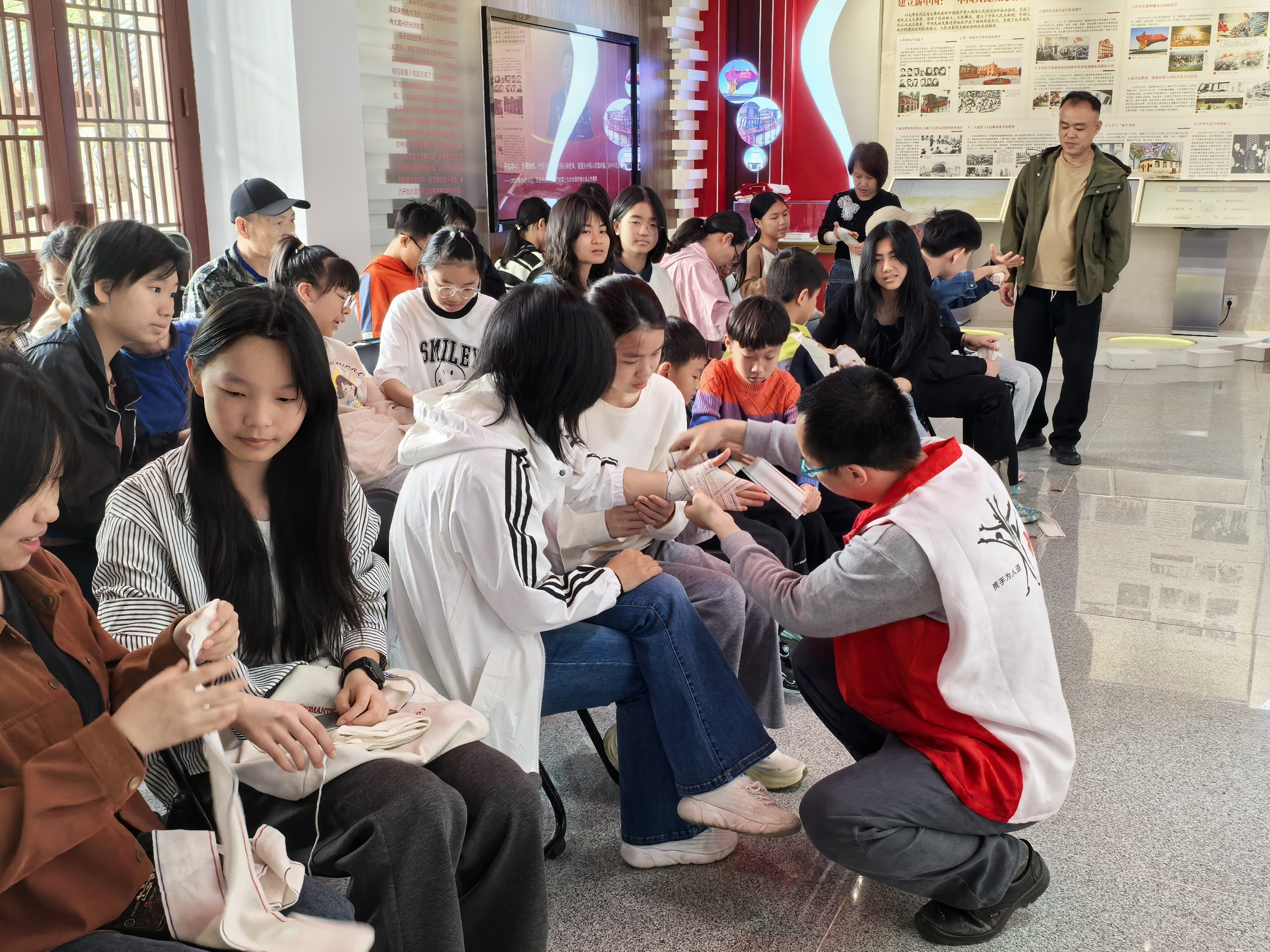 理论入脑,实操入心。活动最后,大家在讲堂门口处围成一圈,开展了一场别开生面的“绳结实操课”。在志愿者的耐心指导下,大家动手练习,将刚刚学到的理论知识转化为实践技能。“以前遇到出血只知道用纸巾捂,今天学了才知道包扎还有这么多讲究!”现场群众纷纷点赞这堂“救命课”既实用又有趣。