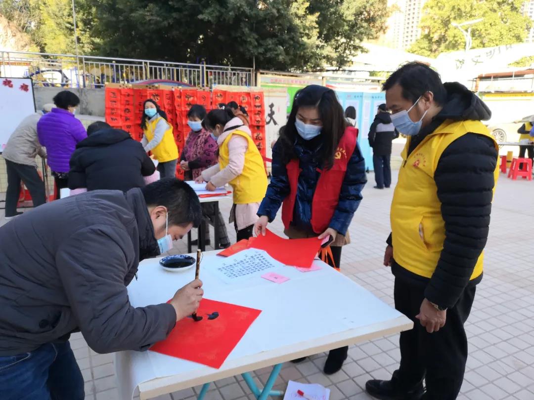 活动现场,几张桌子依次排开,红纸、笔墨一应俱全,书法志愿者们挥毫泼墨,为社区居民书写春联送祝福,“迎春迎喜迎富贵 接财接福接平安”“天增岁月人增寿 春满乾坤福满门”……一幅幅火红的对联,一张张喜庆的福字,饱和寓意的祝福语,带着淡淡的墨香,不仅增添了年味,更是表达了一份诚挚的新春祝福。